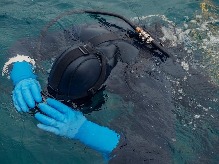 You’ll learn about equipment maintenance, pre-dive checks, and troubleshooting common issues. Diagrams and illustrations aid in understanding the assembly and disassembly of gear. The manual emphasizes the importance of properly fitted equipment for safety and comfort, ensuring divers are well-prepared for underwater exploration and can confidently manage their gear.